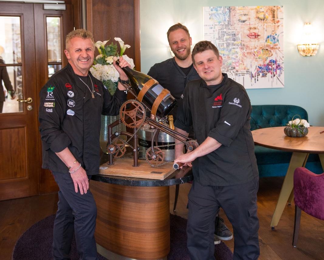 Die VINO VELO bei Rolf Straubinger auf Burg Staufeneck im "fine dining" begeistert die Gäste nicht nur mit Rotwein. Die große Flasche Grappa sorgt ebenfalls für Aufmerksamkeit.